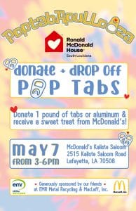 Please ONLY  bring pop tabs to this event,  all other METAL recyclables to be dropped to EMR on Cameron St.